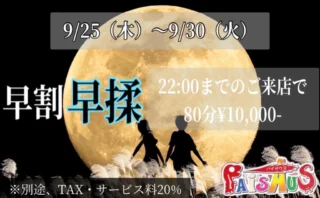 指名料、サービス料別途、TAX20% 22時までのご来店のお客様に限ります 受付の際にスタッフにお申し付けください 通常の40分SETもご利用頂けます‼️ 案内所からの併用は致し兼ねますので ご了承下さいませ‼️